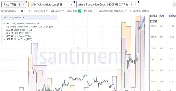 根据区块链分析平台Santiment的数据显示,与TRB相关的加密鲸鱼交易和活跃地址数量迅速增加。具体而言,在5月6日,每日活跃地址达到了212个,而涉及超过10万美元交易金额的大宗交易则有16笔。