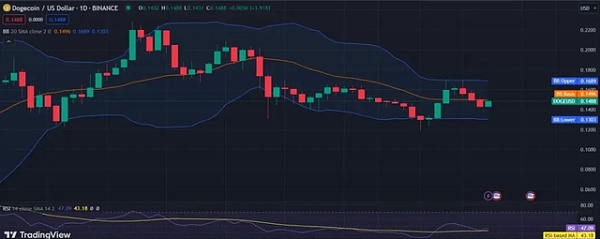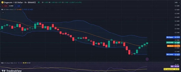 具体来说,狗狗币布林带的上限为 0.1515 美元,作为 DOGE 的阻力位,而下限为 0.1425 美元,表明强劲的支撑位。这种区别强调了狗狗币定价动态的动态性质,并强调了密切监控这些指标以准确预测潜在市场走势的重要性。