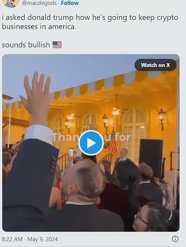 在周三晚些时候,特朗普在佛罗里达州棕榈滩的马阿拉歌庄园举行的一场引人注目的聚会上宣布支持加密货币。这次聚会被称为“特朗普纸牌NFT晚会”,参加者都是持有印有特朗普名字和肖像的NFT证书的支持者。