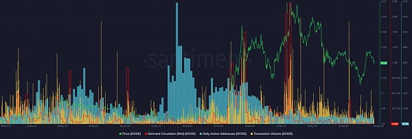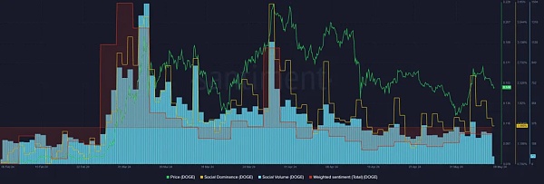 社交主导地位出现峰值,但社交量没有太大变化。这也并没有表现出乐观情绪,但表明狗狗币在社交媒体上的提及至少是一致的。