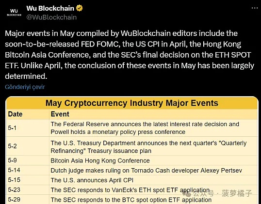 特别是,SEC 5 月 23 日对 VanEck 以太坊现货 ETF 申请以及 5 月 29 日比特币现货期权 ETF 申请的回应可能会成为市场走势的潜在触发因素。