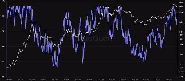 盈利能力在市场心理中至关重要,特别是当宏观经济状况不利于风险资产时。因此,分析参与者的盈利能力可以为了解市场状况和情绪提供有价值的见解。该图表显示了供应利润 (%) 指标,代表比特币供应利润的比例。