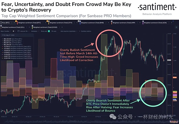 比特币和山寨币有望稳步复苏:链上数据提供商Santiment补充说,由于比特币价格在减半后并未立即上涨,因此目前市场上存在过度看跌的情绪。这种 FUD 增加了反弹的可能性。