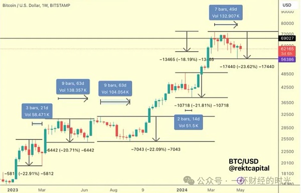 根据 Rekt Capital 的分析,比特币在当前价格范围内的整合(减半后最高可达 70,000 美元)可能预示着周期的减速。