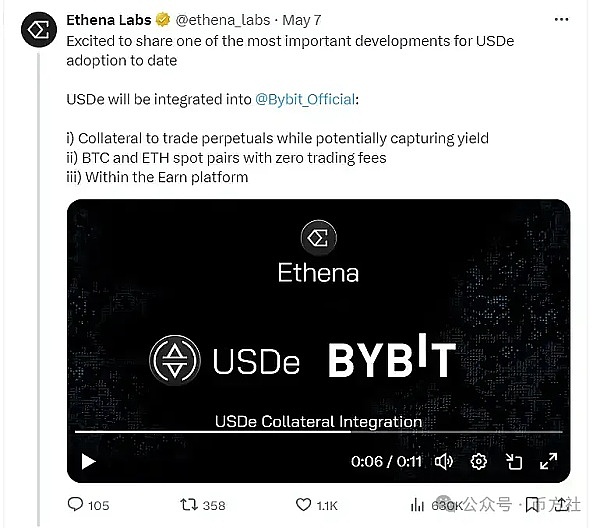 社区成员抢先宣布这一消息后,本周一 ENA/BTC 交易对出现了不错的涨幅,随后 Ethena Labs 官方推特于本周二发布了 USDe 将集成到 Bybit 交易所的消息,Bybit 是四月份期货交易量第四大的交易所。当日下午,ENA 飙升至 1 美元,创下五月份以来的新高。