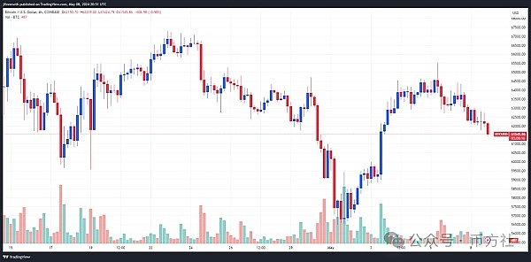 周三,加密货币市场又经历了一天的波动盘整,比特币在交易时段早些时候承压下跌,下午在 62,000 美元的支撑位附近出现了多头和空头之间的激烈争夺。 比推数据显示,比特币全天在 61,430 美元至 63,020 美元区间震荡,大部分时间在 62,000 美元附近挣扎,截止发稿时,比特币交易价格为 61,512 美元,24 小时下跌 2.36%。
