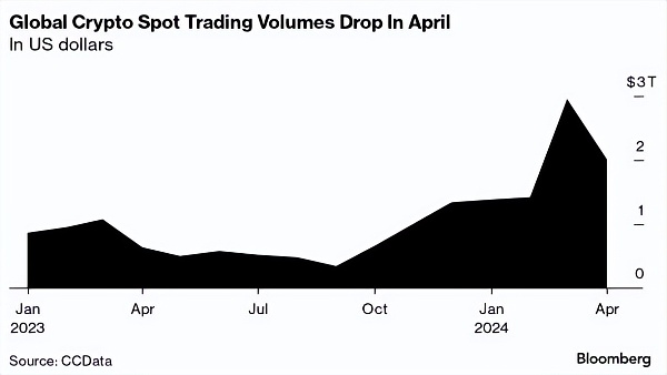 主要加密货币交易所的加密货币交易量在4月份大幅下降。据彭博社周五(5月10日)报道,在比特币价格从73,800美元的历史高点暴跌后,交易量七个月来首次下降。