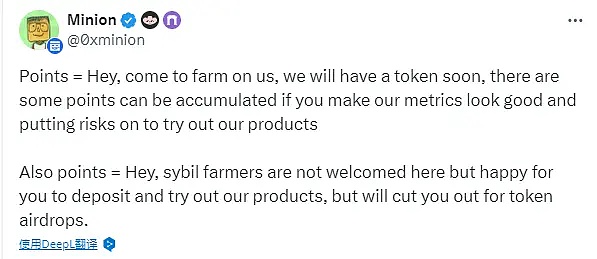 加密用户0xminion曾在社交媒体表示,项目方的积分在暗示用户,来我们这里耕种吧,我们很快就会有代币了,如果你让我们的指标看起来不错,并冒险尝试我们的产品,就可以积累一些积分;有些积分不欢迎撸毛用户,但很高兴您来存款并试用我们的产品,但会将您从代币空投资格中剔除。