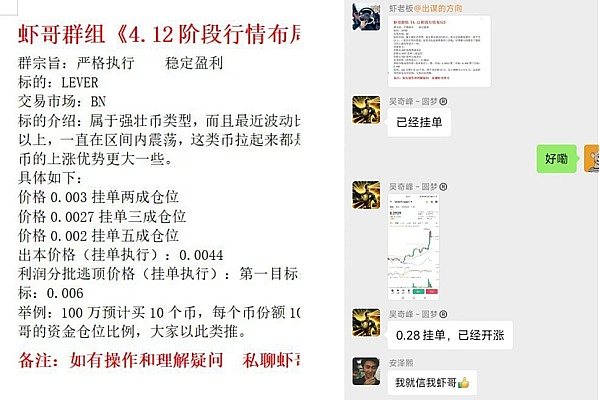 虾哥群组《4.12阶段行情布局》群宗旨:严格执行 稳定盈利标的:LEVER交易市场:BN标的介绍:属于强壮币类型,而且最近波动比较大,每天交易额也都在一两千万以上,一直在区间内震荡,这类币拉起来都是两三倍起,行情磨人的情况下强壮币的上涨优势更大一些。具体如下:价格0.003挂单两成仓位价格0.0027挂单三成仓位价格0.002挂单五成仓位出本价格(挂单执行):0.0044利润分批逃顶价格(挂单执行):第一目标:0.0053第二目标:0.0054第三目标:0.006举例:100万预计买10个币,每个币份额10万,以上理解为2-3-5万,这是虾哥的资金仓位比例,大家以此类推。备注:如有操作和理解疑问私聊虾哥即可