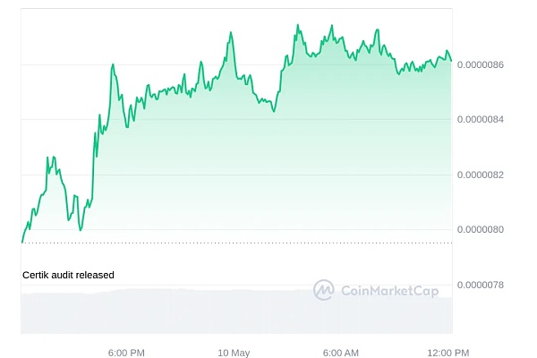Pepe 的价格在过去 24 小时内上涨了 8.21%,目前交易价格为 0.000008612 美元。价值的飙升表明市场对该代币的积极情绪。值得注意的是,该代币的交易价格高于其 50 天和 200 天简单移动平均线(SMA),表明长期看涨趋势。