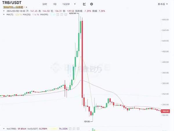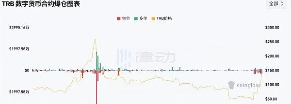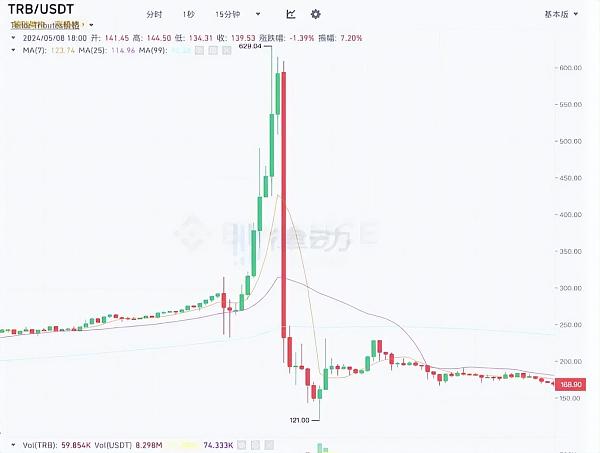 值得一提的是,2023年12月30日的跨年夜,TRB价格经历了惊心动魄的波动。在稳步上升至300美元后,晚8点突然暴跌超过25%,两小时内跌至200美元附近。然而,就在投资者纷纷做空之际,TRB价格却迅速反弹,创下新高并一路飙升至629美元,六小时内涨幅高达165%。