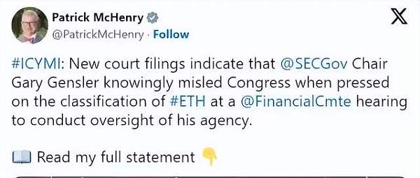 4 月 30 日,众议院金融服务委员会主席 Patrick McHenry 评论了 SEC 与加密货币行业之间不断升级的争执,他指责 SEC 主席 Gary Gensler 对 SEC 对以太坊的立场「有意误导了国会,新的法院文件显示,这是故意歪曲 SEC 立场的故意企图。」他指出,SEC 的公开言论与对 ETH 的私人行动之间存在明显的脱节,这种针对数字资产的执法手段反映了 SEC 监管的任意和反复无常的性质。