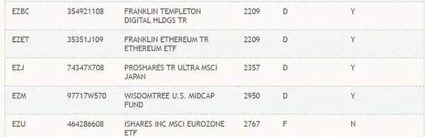 最近,资产管理公司 Franklin Templeton 将其现货以太坊 ETF 列在美国证券存托清算公司(DTCC)的网站上,标签为 EZET。从理论上来说,将此 ETF 纳入 DTCC 网站代表交易过程的第一步。但是,这并不能保证可以得到 SEC 的批准,SEC 将最终决定 ETF 是否可以推出。