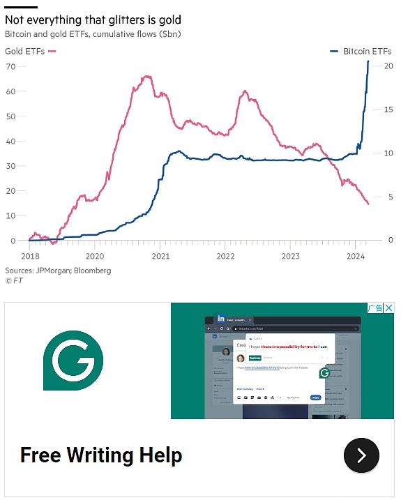 对比特币需求的激增与黄金 ETF 的大量抛售同时发生,尽管黄金价格达到每金衡盎司 2,200 美元的历史新高,但同期黄金 ETF 的资金流出却高达 77 亿美元。