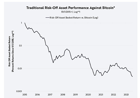 尽管 2024 年第一季度比特币的价值显着上涨,但投资的资本水平仍低于比特币上次突破 60,000 美元时的高度。 这种差异可以归因于特定行业催化剂(例如比特币 ETF、重新抵押和模块化等领域的进步以及比特币第 2 层解决方案)和利率等更广泛的宏观经济因素的结合。 BTC作为避险资产 由于其快速增长和价格波动,比特币通常被视为高风险投资。不过, Ark-Invest认为,比特币网络实际上体现了避险资产的特性,促进金融主权、降低交易对手风险、增强透明度。 作为第一个数字化、独立、全球性、基于规则的货币体系,比特币的去中心化减轻了与依赖中心化中介机构的传统金融体系相关的系统性风险。它作为传输和存储比特币(一种稀缺数字货币资产)的平台。