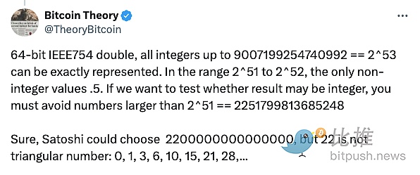 这样一来,整数部分就只能使用53位,也就是最大不超过2^53 = 9007199254740992。而如果希望容易测试结果是否为整数,则最好不要超过2^51 = 2251799813685248。如此,可以选择22(百万亿),但是22不是一个“三角数”(triangular number),所以中本聪选择了21(百万亿)。