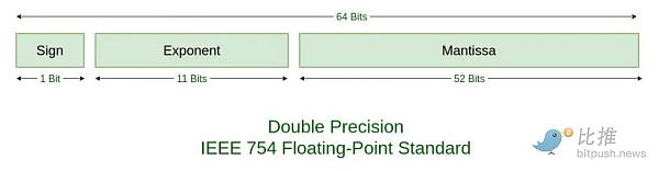 稍微了解计算机原理的朋友都知道,计算机内部并没有什么小数,都是0和1的数位。所谓64位整数,就是指64个0或者1所组成的二进制整数。对应10进制就是2^64 = 18446744073709551616。这个数字要远大于2100万亿。但是,如果要让计算机能够处理浮点数,那么就要把64位中拆出一部分用来表达小数部分,还要留出1位来表示正负号。这就成了IEEE 754浮点数编码标准。其中标准定义,双精度浮点数用64位二进制是这样编码的: