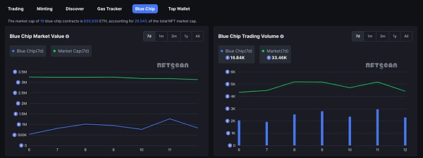 当前 19 只蓝筹合约总市值为 830,938 ETH,占 NFT 总市值的 26.54%。