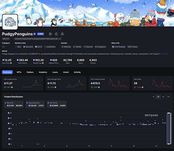 目前 NFTScan 显示, Pudgy Penguins 目前地板价稳定在 12.25 ETH,最高成交价 420 ETH,7d 交易额为 3.4k ETH 左右,目前以太坊上总交易额已超 383.4k ETH,过去 7 天交易分布主要为 Blur: 3.31k(96.09%),Opensea: 134.65(3.91%),X2Y2: 0.0069 单位 ETH,7d 交易笔数达 304 次。