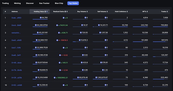 NFTScan 对排名前 1000 的 NFT 持仓价值钱包地址进行了分析,当前持有价值排名前 10 如下图所示: