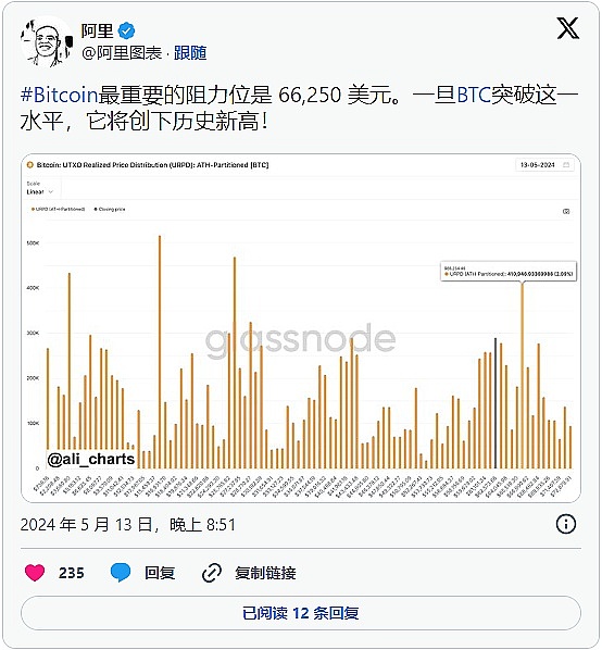分析师注释:著名的加密货币分析师和交易员Ali Martinez提请人们注意 66,250 美元作为比特币“重要”阻力位的重要性。