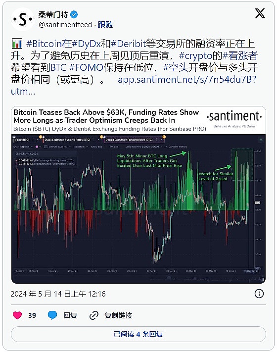 链上分析公司 Santiment 强调,比特币在主要衍生品交易所的融资利率正在上升,引发了人们对市场杠杆率过高以及随后市场调整的担忧。