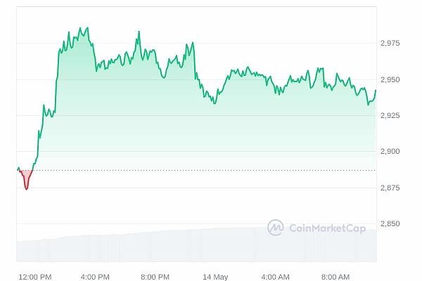 以太坊价格上涨1.88% 至 2,941.82 美元,市值达 3534 亿美元。与此同时,ETH 交易量猛增 53.71%,达到 122.3 亿美元。