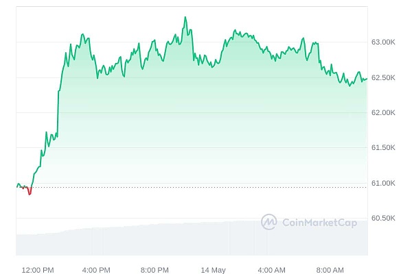 比特币价格飙升2.57 %,达到 62,487.50 美元。另一方面,过去 24 小时内其交易量飙升 65.26% 至 277 亿美元。与此同时,加密货币的市值为 1.23 万亿美元。