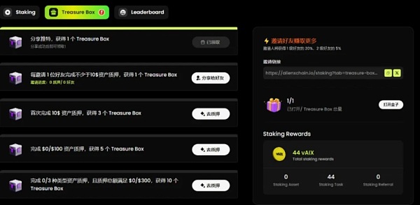 3、除了分享推特获得箱子之外,还可以完成资产质押以及邀请好友,其中前四个任务比较简单,成本比较低,可以参与。官方将分配20%的代币给参与质押的用户,每天获取vAIX,预期整体收益率会比较高。