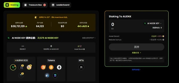 近期加密货币市场走势并不明朗,行情在震荡中消磨了不少投资者的信心,但是AI板块却仍然坚挺,AI带来的变革已经开始融入到区块链中。不少DApp项目都引入AI技术,为用户带来更加智能的体验,Web3的红利时代即将到来。AI 对区块链性能的提升是一个重要的方向,ALIENX是由AlienSwap、Offchain Labs和 Caldera 共同推出的由AI驱动的公链,目前也是全网第一个深度结合AI的公链。ALIENX与其他AI项目不同的是它通过在区块链基础设施层面结合AI技术,利用AI来优化公链的性能,同时保证了ALIENX的稳定性,使得ALIENX链能够避免出现故障。ALIENX主要基于Arbitrum Orbit技术构建,团队获得OKX等投资机构的1700万美元融资,背景深厚,技术实力也不可小觑。ALIENX分别与OKX Wallet和Gateio Wallet合作进行了空杸活动。四月份还进行了X-BOX宝箱空杸。随着项目AI Node销售的推进和Staking功能的推出,官方再次推出了社交任务空杸与Staking奖励活动。根据官方信息,ALIENX将于6月份上线主网,届时空杸代币vAIX即可兑换为主网代币,因此现在是TGE前参与0撸空杸的最后机会。ALIENX空杸活动详情ALIENX在近期推出了Staking质押功能,并为参与者提供质押奖励以及代币空杸,另外完成任务可以获得Treasure BOX宝箱。