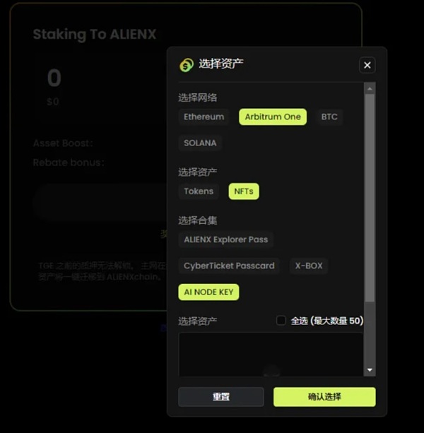 5、最后一个任务,质押3种类型的资产可以选做。质押的资产分为三类:• ALIENX 生态资产(包括 AI NODE KEY、AlienVerse Genesis Plant Pass、ALIENX Explorer Pass以及X-BOX)• Token:MSAT、BTC、ETH、ARB、SOL• NFT(CyberTicket Passcard,可以通过Opensea购买,地板价在0.016ETH左右)。NFT价格会根据市场价或系统给出的价值进行质押奖励的计算。