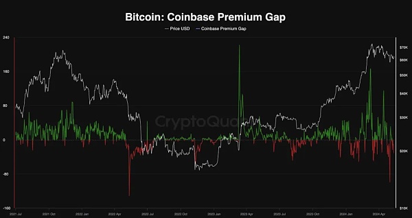 该图表显示了 Coinbase 溢价差距。它衡量 Coinbase 的 BTC/USD 货币对与 Binance 上的 BTC/USDT 货币对之间的差异。所以,它基本上显示了美国市场与其他国家之间的需求和供给的比较。