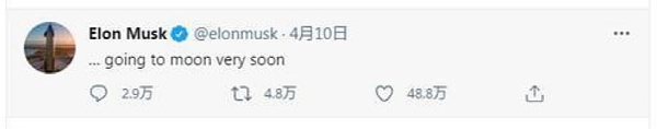 (4月10日早上,马斯克在社交媒体上发帖称:「很快就会冲上月球」,这显然是在引用比特币的流行俚语「冲上月球」 图片来源:新浪财经)