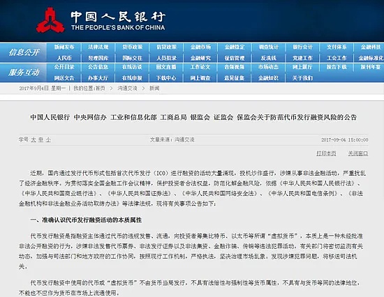 2017年9月4日,中国全面禁止ICO,正式定性ICO本质是非法融资;
