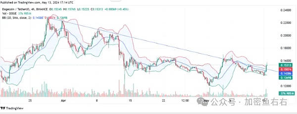 TradingView 上显示的 DOGE/USDT 4 小时图表显示,相对于布林带上轨 (BB) 的大幅上涨。在自然设置下,狗狗币可能会从该水平反转其趋势。然而,在其价格目前大幅上涨之前,其价格已下跌了 3.55%。