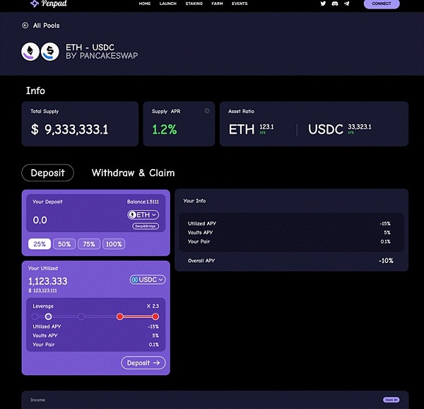 Scroll 上的原生项目 Penpad 近期对品牌全新升级为 Pencils Protocol,升级后该生态拓展为集 LaunchPad、Staking、Vault 以及 Shop 等于一体的综合性生态,并能够向 DeFi、RWA 等方向深度的拓展叙事。在 Pencils Protocol 全新推出的 Vault 板块中,对原有的流动性搲石广玩法进行了全新的升级,引入了类似于借贷玩法的杠杆搲石广模式,支持用户从 Vault 池中借贷资产并实现多倍收益,同时参与 Vault 的杠杆搲石广还有望实现多个生态的积分激励,可谓是一鱼多吃。首创的杠杆搲石广玩法Vault 板块是 Pencils Protocol 在实现品牌升级后所推出的重要产品,其允用户在 Pencils Protocol Vaults Pool 中选择感兴趣的 LP 标的进行参与,并从中获得 LP 收入。与此同时,用户可以设定搲石广杠杆倍数,比如用户持有 1 个 ETH,可以基于此向 Vault 池进行倍数借贷,通过增加搲石广持仓的方式获得收益,Vaults 合约将自动从Staking存款池调配所需杠杆资金,满足用户对更高回报率的追求,提供便捷高效的资金增值体验。而在用户进行杠杆借贷时,他们需要支付对应的利息以支付给 Staking 用户,并在撤回 LP 后自动向合约归还资金。Vault 玩法的优势在于杠杆搲石广模式,从现有的 LP 搲石广玩法看,现阶段绝大多数 Farming 玩法都无法为用户提供可观的收入,根据 defillama 数据显示,DeFi Farming APR 基本都在 5% 以下。