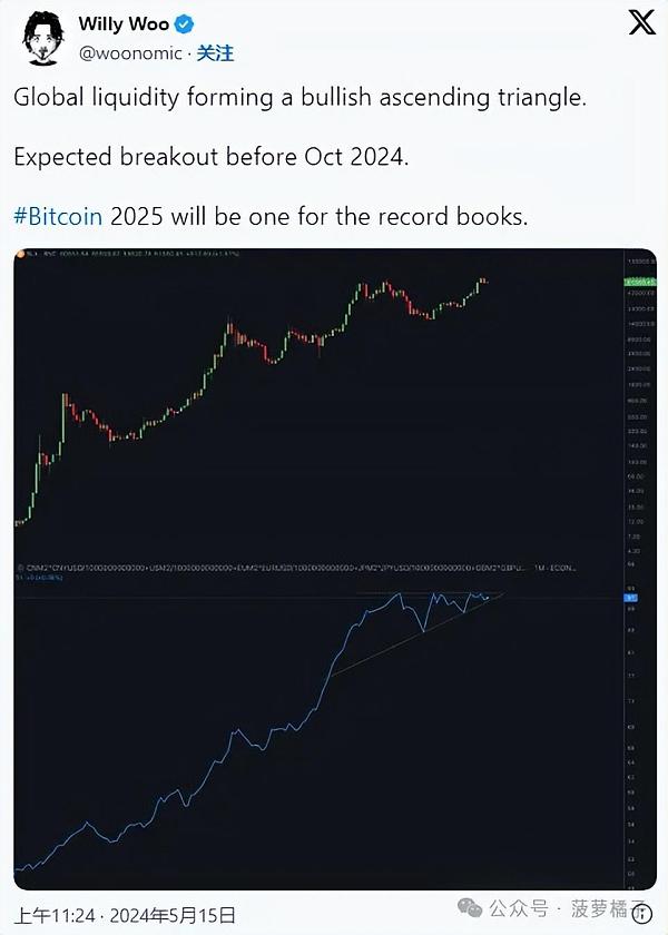 比特币分析师 Willy Woo 发现了全球流动性的看涨模式,并将其比作上升三角形。他预计 2024 年 10 月之前预计将突破这一模式,这预示着 BTC 的潜在看涨势头。Woo 的分析表明,2025 年之前的一段时期对于比特币来说可能是历史性的。