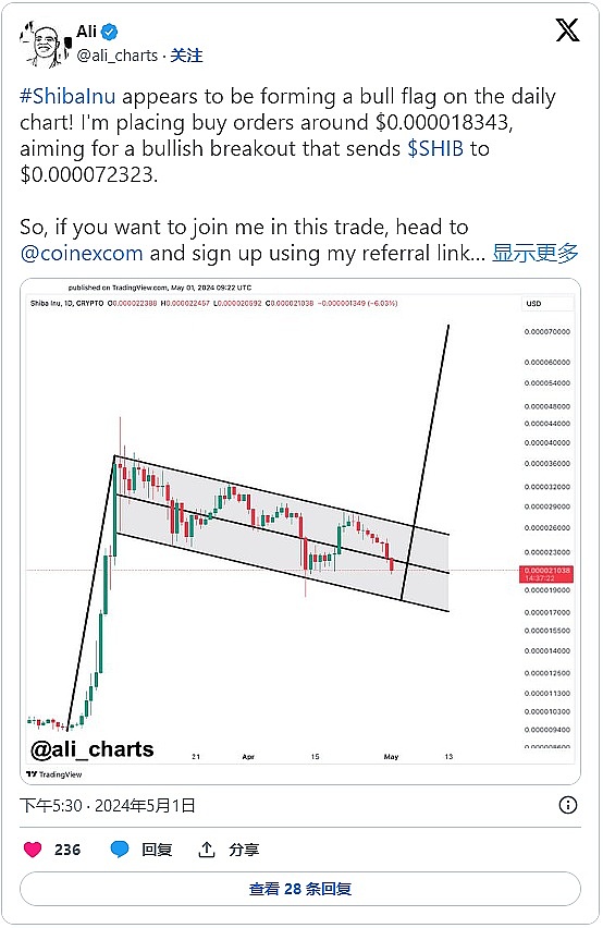 这种鲸鱼活动与 SHIB 的潜在看涨信号同时发生。根据著名加密货币交易员阿里·马丁内斯 (Ali Martinez) 最近的一篇文章,柴犬的日线图似乎正在形成“牛旗”,这是一项表明价格即将飙升的技术指标。