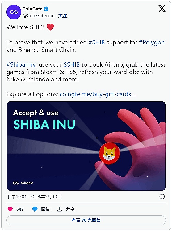 根据 CoinGate 在社交媒体上发布的帖子,这种受 meme 启发的加密货币现在可以用作 Steam、Nike、Spotify 和 Airbnb 等主要零售商的支付方式。