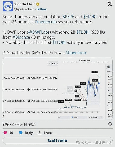 与此同时,随着今天meme股票的复苏,meme币板块也随之复苏。