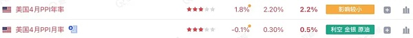 尤其是美国4月PPI月率预测值0.3%,公布值0.5%;大幅高于预期。PPI跟CPI可以归为同一类型的指数,PPI代表生产者指数,CPI代表消费者指数。she裙+v(L20240098)他们都是通胀情况的最直接表现数据。但好在美元指数和美债收益率仅在PPI公布的时候拉了根小针,随后就下跌至更低水平。今晚的CPI才是重头大戏,请大家坐稳扶好。