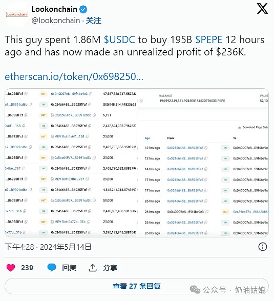 大型投资者或“鲸鱼”也表现出了浓厚的兴趣。Lookonchain 注意到,近期有交易员投入 186 万 USDC 购买了 1,950 亿个 PEPE,实现未实现利润 236,000 美元。另一只鲸鱼以 426 万美元的价格从币安收购了 4.0674 亿个 PEPE,此前其 PEPE 投资获利 372 万美元。