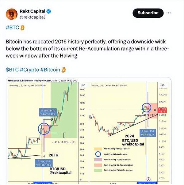 匿名加密货币交易商Rekt Capital表示,比特币完美地重复了2016年的历史,在减半后的三周时间内,比特币出现了低于当前重新积累区间底部的下行烛线。Rekt表示,周期此时的重新积累范围是低于61,081美元的任何价格。Cane Island Alternative Advisors创始人兼投资经理Timothy Peterson指出,价格从历史最高点 (ATH) 图表的下跌(衡量比特币在特定时间范围内从峰值到最低点的跌幅)作为表明比特币当前价格的指标到2025年初,价格可能会上涨近六倍。根据采用情况和之前的提款情况,我们可以猜测未来9个月内该周期的峰值将在175,000美元至350,000美元之间。