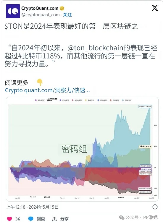“在主要的 Layer 1 区块链中,TON 和 BNB 是今年唯一表现明显优于比特币的资产。在我看来,TON 相对于比特币的相对优势加上 Telegram 的网络效应使其成为值得监控本次牛市的加密货币。”
