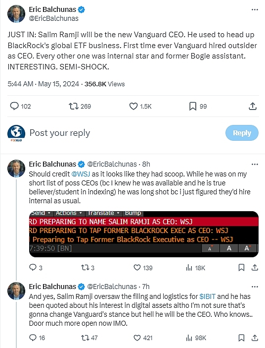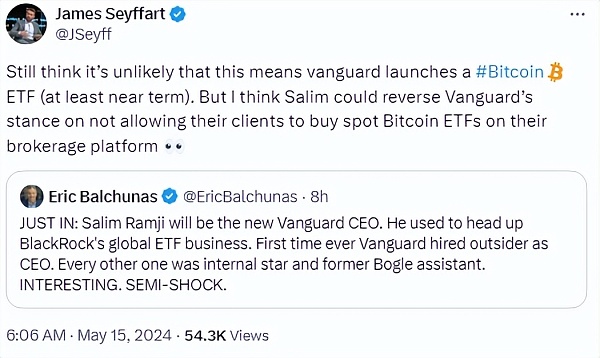 彭博ETF分析师James Seyffart推文表示,他不相信拉姆吉能够看到先锋集团推出自己的比特币现货ETF产品。