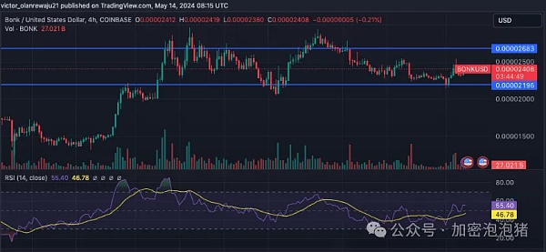 如 4 小时图所示,BONK 试图突破 0.00002668 美元的阻力位未果。截至发稿时,代币价格为 0.00002405 美元。然而,多头一直坚守 0.00002196 美元的支撑位,确保价格不会跌破该区域。