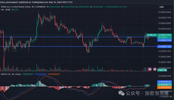 在 0.000021 美元的坚实支撑下,SHIB 成功突破了 0.000023 美元的阻力位。按照这一趋势,SHIB 的下一个目标可能是上涨至 0.000025 美元。这一预测由移动平均收敛分歧(MACD)指标支持。