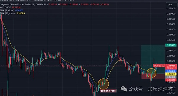 截至发稿时,DOGE 的价格为 0.15 美元。指数移动平均线(EMA)表明代币可能会走高。4小时图上形成的金叉是其中一个原因。