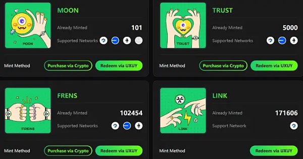 目前,UXLINK已开启3款空投凭证 NFT 社区限量销售,分别是“MOON”,“TRUST”及“FRENS” NFT,购买者将继承相应代币空投,并享有 UXLINK NFT 其他同等权益,据官方介绍销售将持续两周,而第一季度空投凭证 Mint仍在进行中。