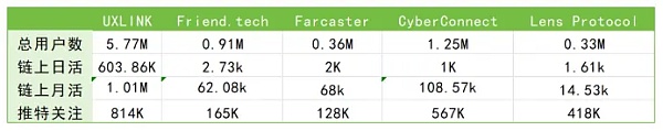UXLINK当前拥有约577万用户,推特粉丝814K,官方TG群约24万人,且链上UAW高达896.26K。考虑到UXLINK作为新一代社交应用的创新特性,以及对前两代社交产品的改进,其总用户数和活跃用户基数均大幅超越CyberConnect。
